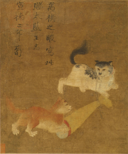 朱瞻基(1399—1433),明代。朱元璋曾孙,建元宣德,在位十年(1426—1435),庙号宣宗。雅尚翰墨,尤工绘事,山水,人物,走兽,花鸟,草虫无不臻妙。尝作图书赠重臣,铃“广运之宝”、“武英殿宝”、“御府宝绘”、“雍熙世人”等印玺。 明宣宗好书画、促织。