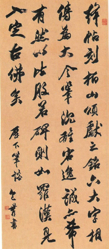 包世臣,1775年生,1855年逝世,安徽泾县人。清代学者、书法家、书学理论家。字慎伯,晚号倦翁、小倦游阁外史。泾县古名安吴,世称“包安吴”。嘉庆二十年举人,曾官江西新渝知县,被劾去官。少工词章。喜兵家言,治经济学。工书法,肆力北魏、兼学“二王”,备得古人神韵。他不但是位书法家,而是一位在书法史上有巨大影响的书法理论家。何绍基称其书名重于江南。著有《安吴四种》,其中《艺舟双楫》下篇为书法理论,提倡北碑,主张转指,对清代中、后期书风的变革影响很大。传世书迹较多。《临书谱》轴,纸本墨迹。草书。凡5行,共57字。纵144.6厘米,横74厘米。天津艺术博物馆藏。包世臣学识渊博,对农政、货币以及文学等均有研究。他为扭转宋代以后帖学的流弊,先后与阮元、康有为同倡碑学,最后致力于篆、隶北碑。一般用笔以侧取势是他书法的主要特点。此碑作品亦不例外。孙过庭《书谱》甚有右军法,包氏临之,大概也属学习“二王”的一种辅助练习吧。通篇点画饱满,但多不能横平竖直,行笔虽纵逸互用,环转连属却不强调,运笔速度较慢,多为一字一停。结体左低右高,横、竖常呈侧斜之势;行距紧凑,作品整体感强,并由于笔画不同侧面的对应使作品得以气势贯通,不觉板滞。由于他用笔过于讲究,放缓速度,随意性也就减弱,造成线条有的地方不够自然,有作做之嫌。